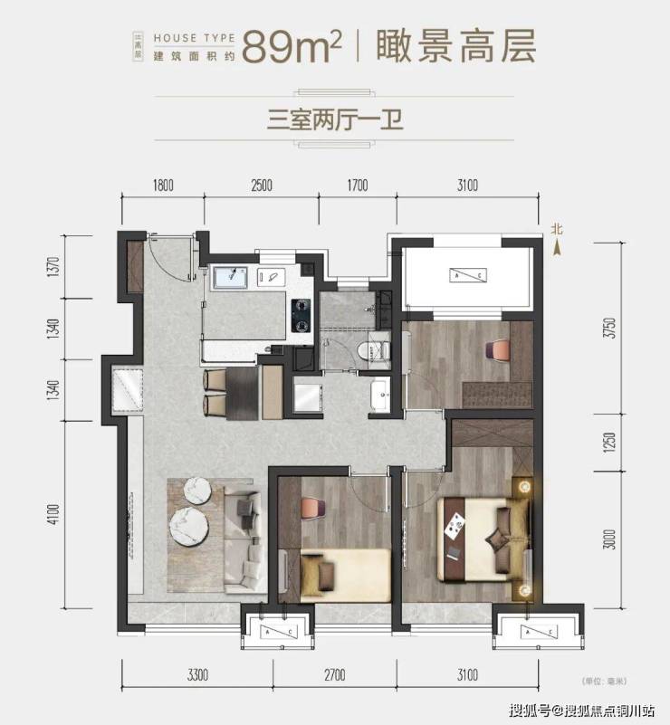 建面约89㎡三室两厅一卫实楼样板间更符合当下市场的主流。
