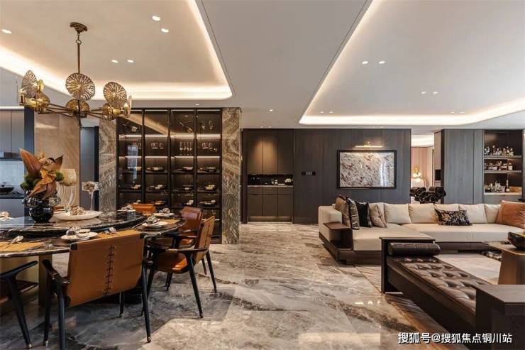 LDKB行政通厅,建面约80㎡阔绰空间,南向约20m超大面宽,构建社交与生活的双重舞台。通过对整个空间的布局分割,保持整体性的同时,区隔出不同的功能区域,最终呈现出高度和谐统一、极具品味的大宅属性。