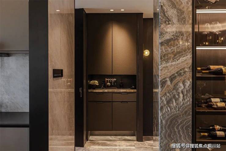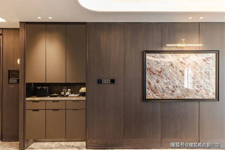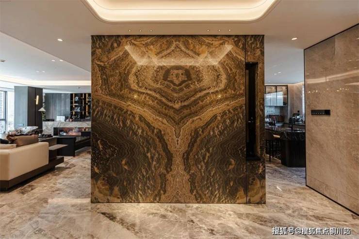 壁炉墙与玄关采用同款奢石,统一设计语言的同时,恰到好处的对空间进行了区隔,将奢美精致的定制格调充分演绎。
