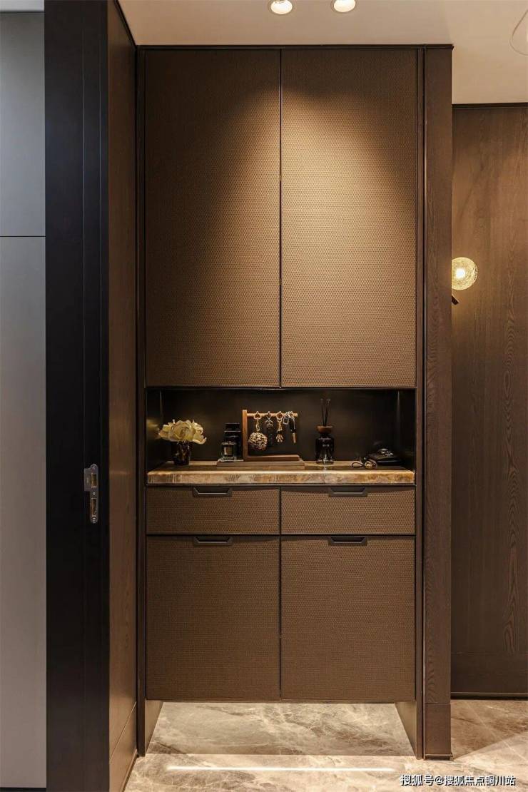 玄关处设独立收纳系统,在满足储物功能的同时,实现了与全屋风格的协调统一,细腻的皮革纹理,让收纳也成为了一种艺术。柜内安装鞋柜精灵,实现除味、杀菌、除湿,保持柜内环境时刻清新干爽。