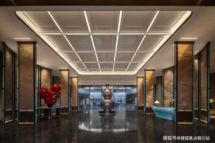 大面积的LOW-E玻璃钻感天幕,让270°的环幕窗景视野,收纳一城峯光。再搭配金色铝板线条,打造镜面感建筑立面,意自东方的气韵与层层描金的典雅,时刻辉映着沙湖如画美景。