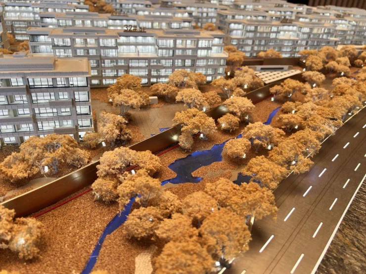 南园则做出了高台叠瀑,目前实景还没出来,但只看沙盘,营造的氛围就能感受到金基的用心
