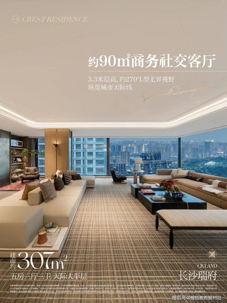 长沙瑞府打造层高3.3米建面约307㎡云端大平层,约90㎡的社交客厅搭配270°的环幕式全景窗,让城市霓虹成为脚下的画卷;