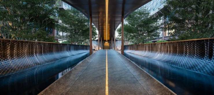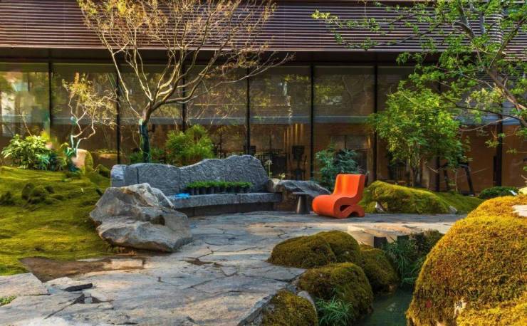 移步下沉庭院,叠瀑水景如脉络般串联起山、台、石、林、池,宛然一幅立体的水墨盆景跃然眼前。七株油松坚韧挺拔,天然原石错落有致,地被苔藓铺就深邃绿茵。