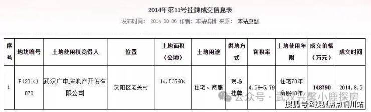 2014年8月5日,广电集团以14.87亿底价拿下汉阳老关村地块,该地编号为P(2014)070号,净用地面积145356平方米,容积率为4.58-5.79,楼面地价2030元/平,用途为住宅、商服。