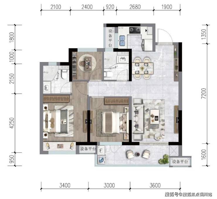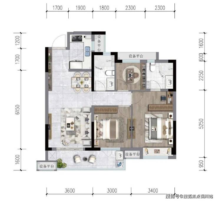 另一款建面约115㎡的户型,就更绝了,同样是三房两厅两卫、三开间朝南、主卧大套房的设计,尺度上却是PULS版本,格局也更加方正。