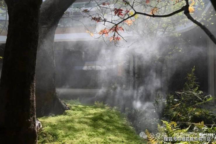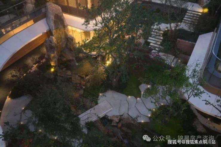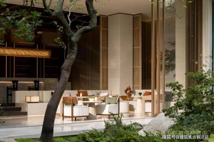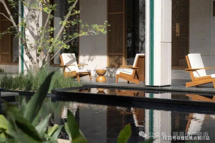 哪怕在园区走马观花一遭,也随时随地为触目可及的格调和韵味叹为观止。石材景墙叠砌,前面是朴树红梅紫薇,背后透出苍郁青峰,隐与奢共绘“千里江山”。立面造型竹韵温润,围界选材烁如黄金,合谱一曲“金玉满堂”。毛石墙面,自然肌理,实木椅子,坐感舒适,格栅梳理光线,花艺表达四季,一起赶走疲倦,松弛出舒适。三层台地,可行,可望,可游,可居,具象化了“溪山行旅”,璞岩叠谷,老树、巨石、飞瀑、软瓷岩壁,向崂山元素致敬。