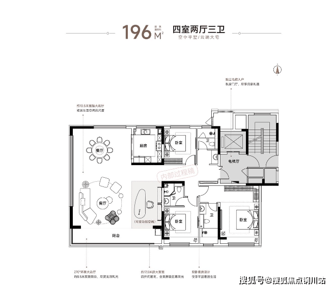 196㎡四室两厅两卫:项目楼王大平层产品,户型方正,南北通透,270°转角宽厅设计,空间明亮开阔。同时配备10米双厅设计,尽显空间尺度感,卧室配备双套房设计,提升居住舒适性与私密性,尽显平层奢华生活品质。