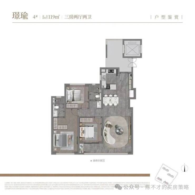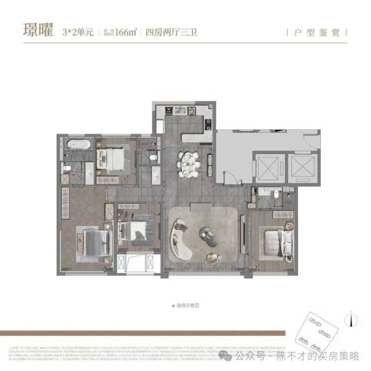 主要讲讲这个166的户型,得房率约103%,媲美三代住宅200平的体验!