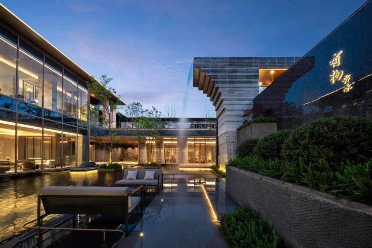 景观设计:以艺术为出发点,打造了具有特色的生活美学馆,馆内有芙蓉花主题装饰,两侧设置珠绣展柜、掐丝珐琅展柜等非遗文化展示。还打造了约 8 米高的跌水飞瀑,并以此为中心形成「美庐私宴厅」「下沉式会所」「庐悦会馆」「庐研工坊」四大主题功能区,形成错落有致的多级景观。