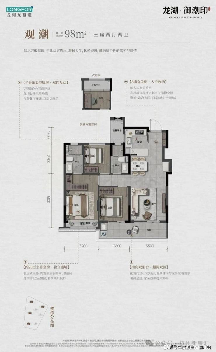 御潮印起步面积约98方,3房2厅2卫,南向约9.5m,双开间阳台全明户型。采用S墙玄关柜、主卧独立衣帽间等多种手段,提高储物效率。御潮印98方给了很多300万预算的朋友,买到钱江世纪城2.0的机会。