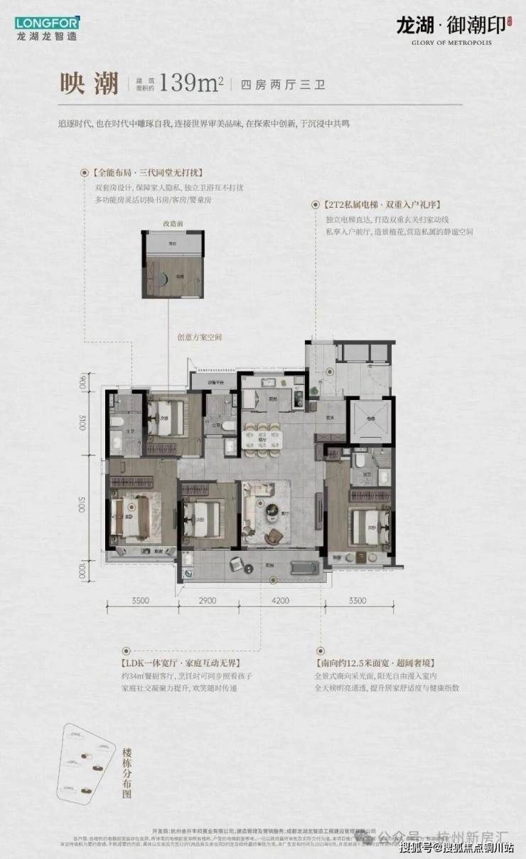约139方户型,南向面宽则达到了惊人的约13.9m,四开间半朝南,客厅面宽约4.2m。关键做到了3卫双套房,特别适合三代同堂。同样约139方三卫,世纪城的君品是2T4的,而御潮印则是2T2,独立私梯入户,还拥有阳光入户花园和双重玄关。