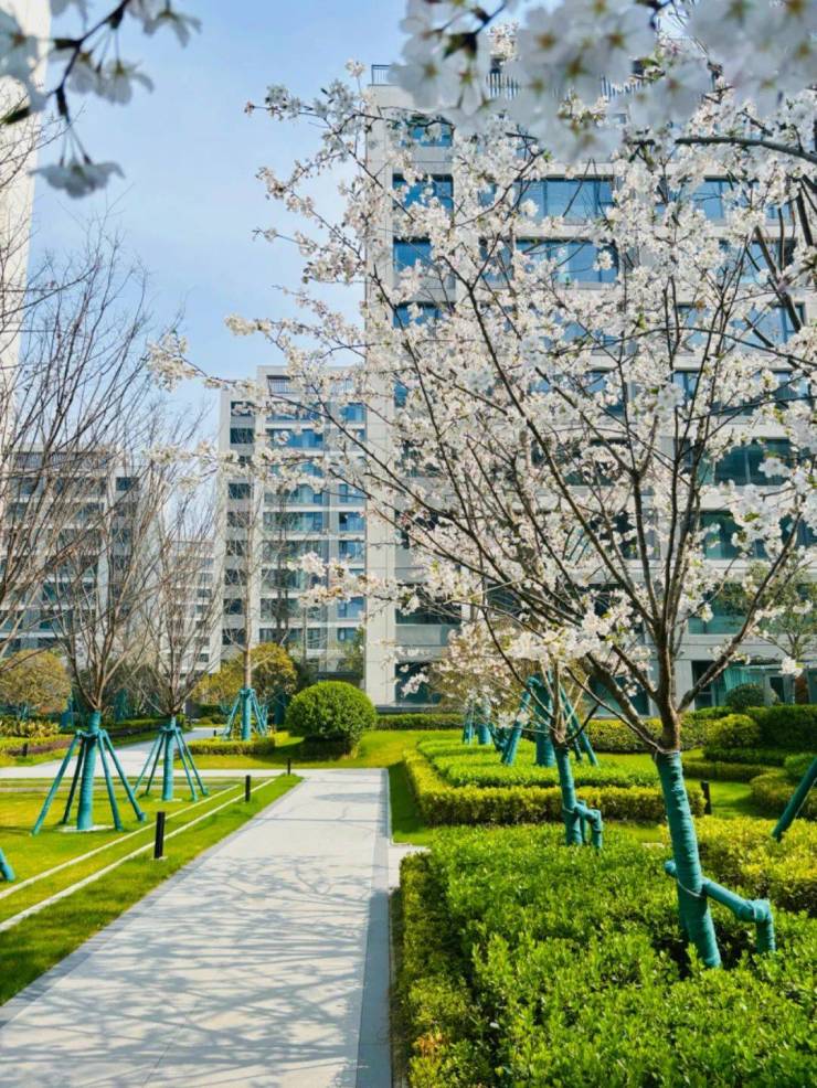景观设计:采用现代简约设计风格,外立面采用双银中空 low-e 玻璃,天幕里面。小区入户大堂采用现代山水元素,内部绿化设计了南北中轴景观和东西中轴景观,东西向生态景观轴沿东西向延展 400 米,直通东侧滨水景观。