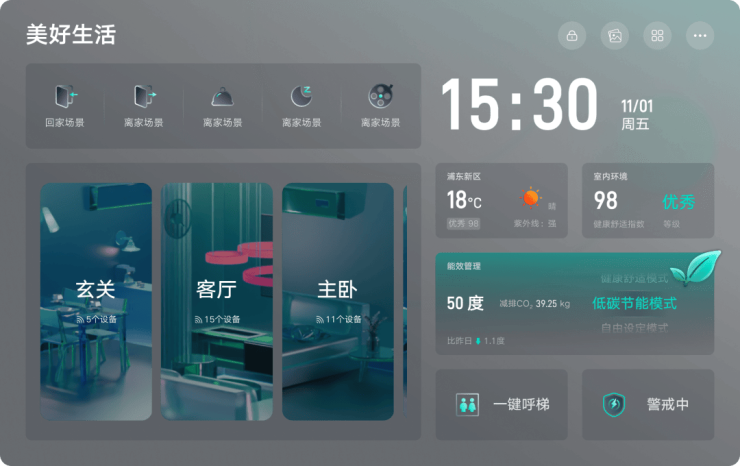 除此之外,智慧场景贯穿生活全周期:离家模式一键启动,灯光、空调自动关闭,窗帘合拢,安防系统同步布防;访客到访时,远程可视对讲、智能解锁与一键呼梯功能无缝衔接,尽显归家仪式感。