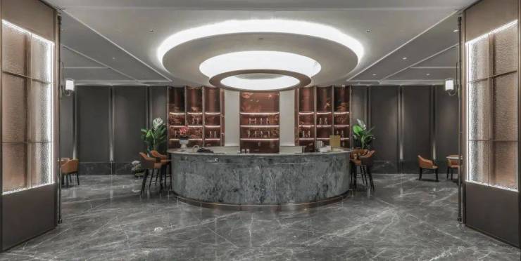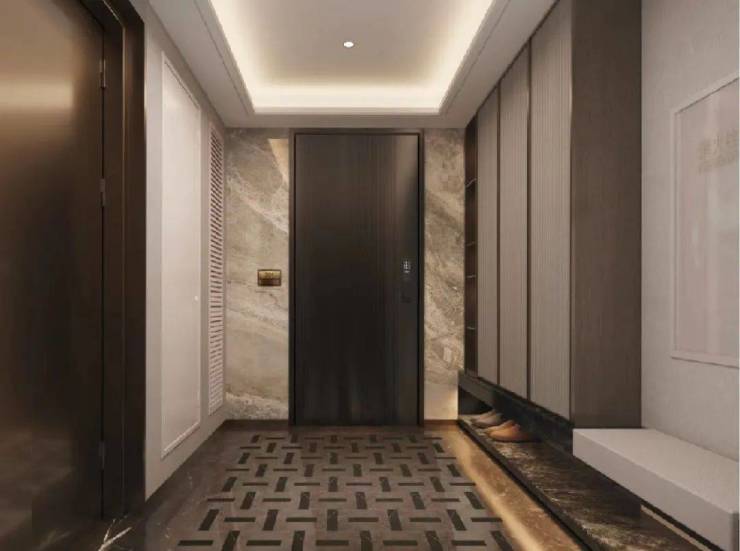 海信·君安打造济南首个“AMAN落尘区”,采用与户内完全同质的定制天然纹理岩板饰面、地面瓷砖及吊顶系统,实现从公共空间到私密领域的无缝过渡,带来“出梯即入户”的空间体验。从根本上解决了传统豪宅“内外有别”的割裂感,更创造性地构建起一个完整的身份转换场域。