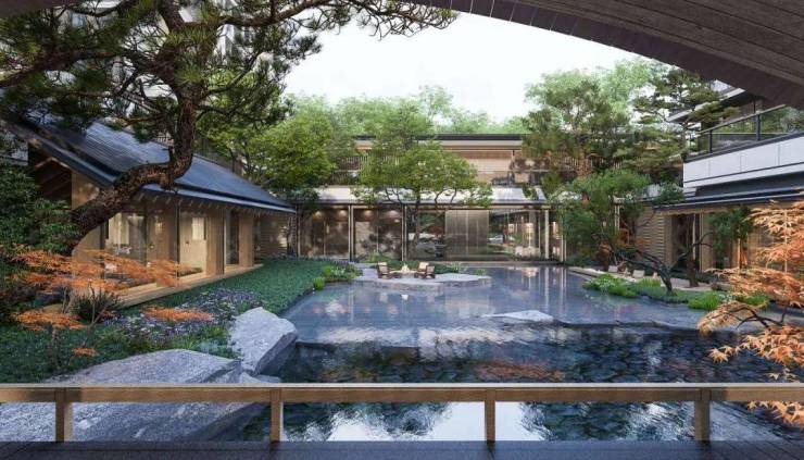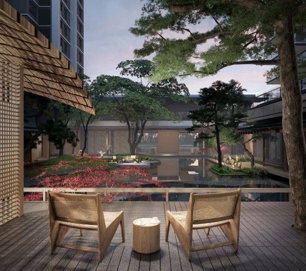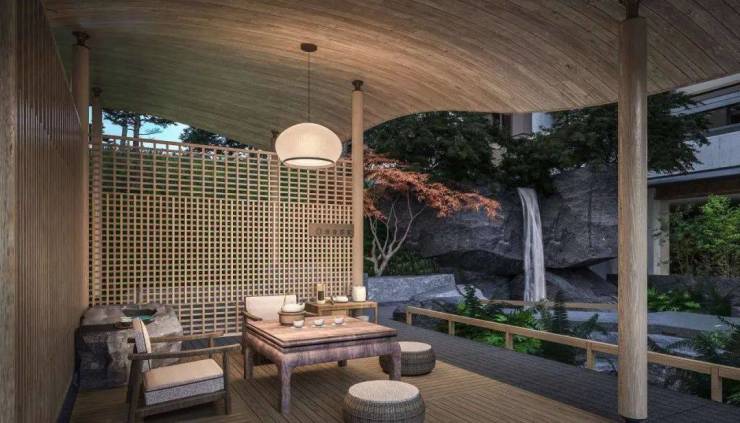 四象中庭以山为笔,突破常规园林的桎梏,对地形进行了全面的丰富。山、林、溪、瀑、池、谷等地形大大丰富了日常的体验感。同时通过山的隔断与高差,灵活组合,使得四面景色各有特点、各具神韵。
