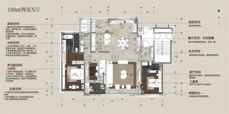 观山隐秀深入洞察当代改善人群的个性化需求,以3大定制内容、超百种定制方案,户型格局、装修风格与家电配置均可实现定制。以建面约188㎡户型为例,在户型布局可选择两室布局,腾挪更多空间打造西厨岛台这样的新型场景,融合社交、休闲、工作等多种功能,让人在忙碌的生活中,也能拥有一个安静独处、享受饮品与阅读的空间;也能定制为四室空间,同时以大宽厅满足三代同堂的家庭社交需求。