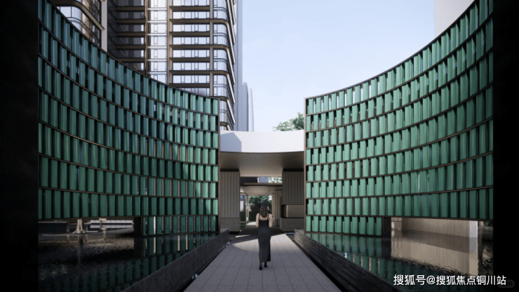为了让业主归家仪式感拉满,项目设计了6米高的定制绿陶板组成的环形门庭,香槟金与青绿交织,如画卷展开。