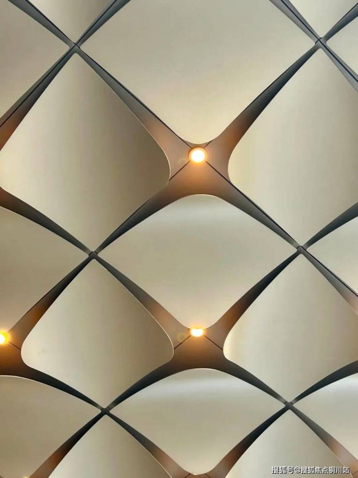 雨篷下,双曲线金属叶片与定制灯具的光晕交织,营造出温暖而轻盈的归家氛围。