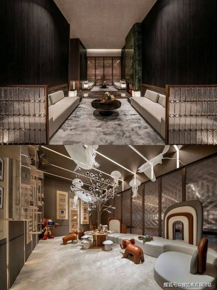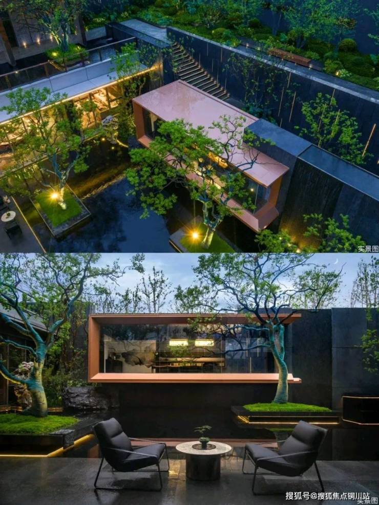 卷大门、卷会所,再继续卷下沉式庭院,这一设计不仅延续了会所和大门的高品质标准,还为居民提供了一个与众不同的休闲体验。这个约600平方米的下沉式庭院,结合二楼星空露台和悬浮茶室,创造出一个沉浸式的会客区域,与风雨连廊相呼应。在这里,居民可以享受到森林般的休息空间、瀑布式的水景以及充满禅意的茶室等景观元素。