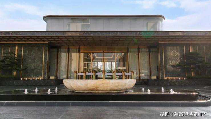 「笔墨门庭」处,宽约58米恢宏主入口,以酒店式落客空间迎宾,彰显归家的尊崇感。形似莲花的聚宝盆水景静卧其中,盆景罗汉松、黑松与蓝钻奢石景墙相映成趣,刚柔并济,寄托福泽绵长的美好寓意。