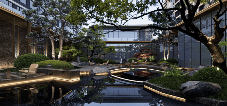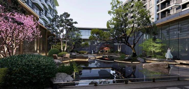 绿城·桂语安澜的「含园量」极高,它在社区上上下下的角落都嵌入了园林。