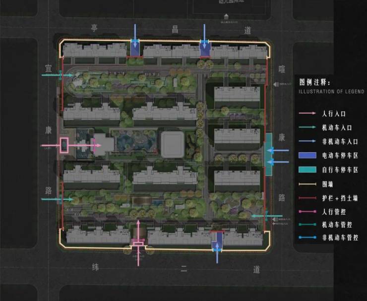 专供人行的主、次入口分别朝向西、南,三个车行入口设于东、西,互相之间保持相当距离,避免动线干扰。
