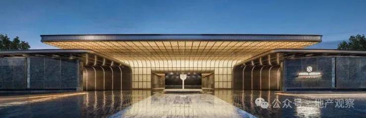 走到大门就能感受到它的气势恢宏:约150 米艺术展廊式入口如同打开了一本立体典藏,金光麻石材+普拉达绿石材景墙,据说单平造价超 8000 元,约6米挑高大门檐口的蟠螭纹铜饰,是商代礼器纹样与项目logo的结合——定制+复刻。