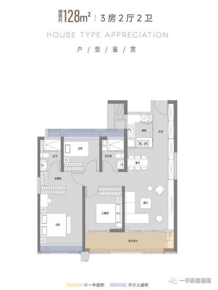 建面约128㎡户型(三房两厅两卫)