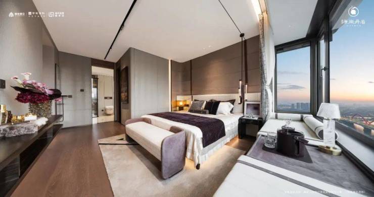 建面约36㎡的主卧套房,超宽南向开间、步入式衣帽间、双台盆+浴缸+淋浴间的奢华主卫。