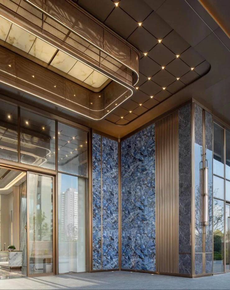 采用阿波罗灰仿石砖与璀璨蓝宝石岩板作为建筑主体材质,巧妙融入香槟金装饰板以点缀细节,凸显材质独特的质感与天然纹理,营造出高贵而不失温馨的视觉感受。