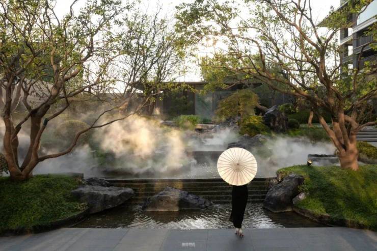景观上以“堂前水势盛,家旺人盛子荣归”为设计理念,门前抱水聚财源,细流潺潺预示财源滚滚。汲取河流走势之美,融入贾鲁河的地域文脉,特色水纹砖铺装巧妙拼接,彰显匠心独运与细腻工艺。
