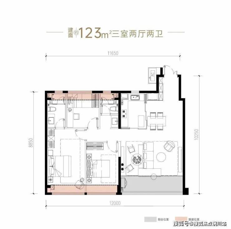 建面约123平三室两厅两卫户型是中间户,5.6米的南向横厅,让客厅的采光通风效果得到保障,点击查看户型: