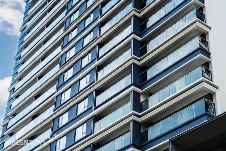 同时,立面采用断桥铝LOW-E玻璃门窗,搭配铝线条,起到隔音、降噪、降温的作用,阳台采用水晶灰的钢化玻璃栏板,与蓝灰色的主基调和谐过渡,兼具功能实用与美学观感。