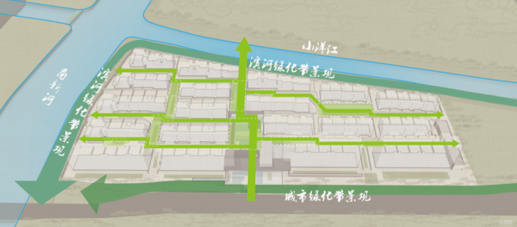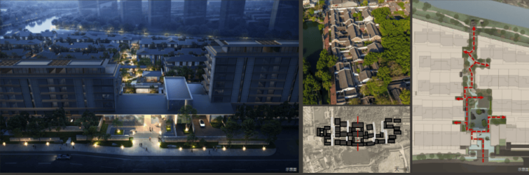 整个项目摒弃了常规呆板的兵营式阵列,效法宁波「天一阁」三进院落格局,选用灵动的轴线递进式排布。