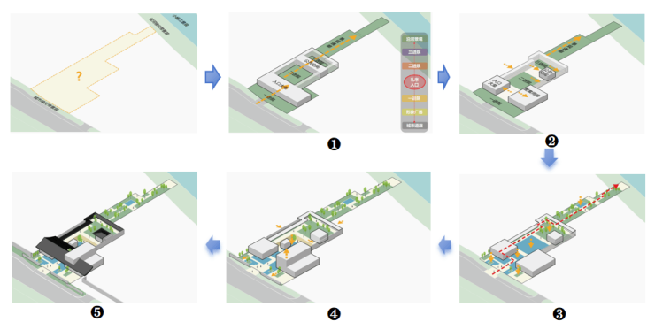 传统纵向展开的归家礼序空间(如下图❶),往往与城市绿化带景观割裂,社区内的园林景观也被切碎。