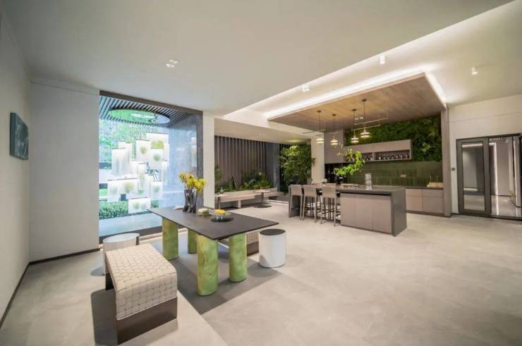在社区的营造上,项目采用全域架空层设计,所有架空层都精装交付,功能齐全,颜值在线,将不同主题散落在社区各地,与园林交织在一起,整个社区有移步异景的层次感。