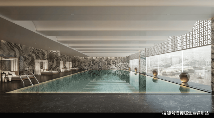 约2000平的下沉式会所中,拥有恒温泳池、健身中心、茶室、私宴厅等功能区,让业主足不出户就能享受全天候的酒店式生活方式,后期则由专门运营团队统一运营。