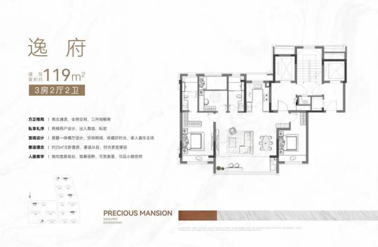 建面约119㎡三房两厅两卫,开间约6.4米的大横厅、建面约25㎡的主卧套房、南北5飘窗等,亮点太多。