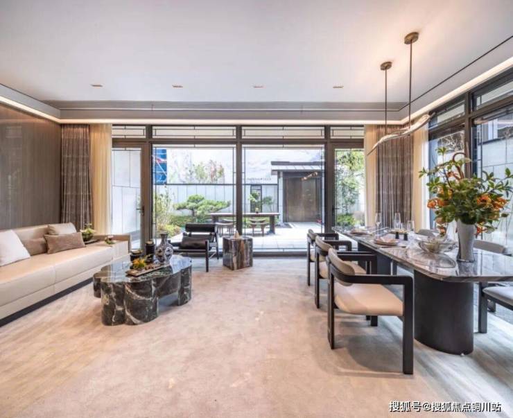 约7.2米的大横厅,搭配大玻璃镜面,直面庭院四季风光,别墅到院子,化实为虚,解构生活,描绘大宅生活尺度。