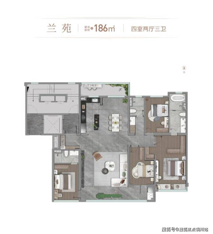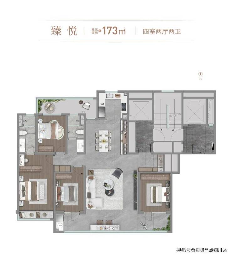 173平的四室两厅两卫是两梯两户独立电梯厅,南向四面宽,整体采光面约14.7米,LDKB空间一体化设计。约11.2米三连阳台,搭配全面屏落地窗,IMAX级风景视野。