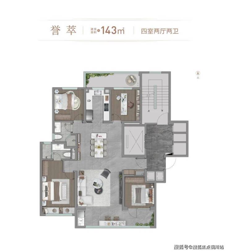 143平户型是一梯两户,四叶草布局,四间卧室位于房间的四个角,空间独立互不打扰;南向三面宽,整体采光面约11.3米,LDKB空间一体化设计。