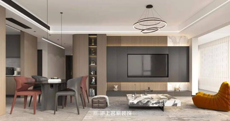 开放式布局打破空间边界,客厅、餐厅、厨房流畅衔接 。悬浮式吊顶 + 线性灯,勾勒简洁轮廓。环形吊灯与长条灯,营造层次光感。