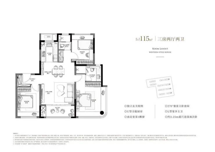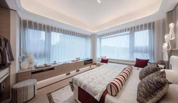 主卧270°L型转角飘窗: 虽然是115㎡,也做了行政级主卧套房,还带来了270°的转角飘窗,在提升得房率的同时,极致扩大了采光面与景观视野,以此来保证业主在不同光线、不同视角下都能领略到园区风光;