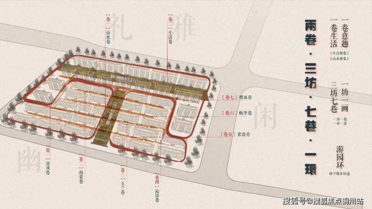 “两卷、三坊、七巷、一环”的景观营造,完美融入了宋风的审美意境,并在不同的景观节点,将五幅宋代名画场景复活:行舟江上、瑞鹤天池、月照松泉、雅集游园、坐茶听雨……