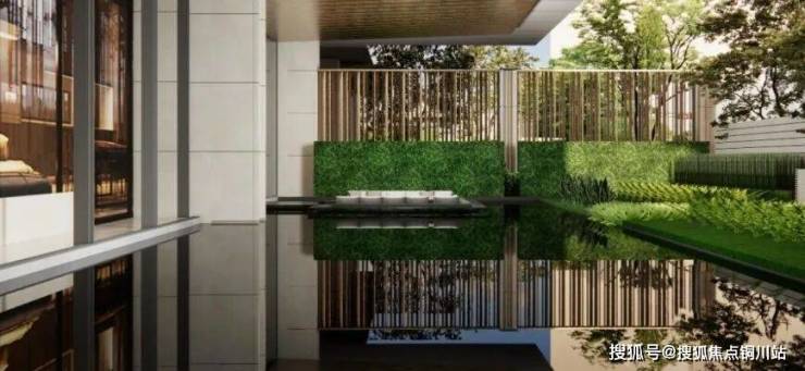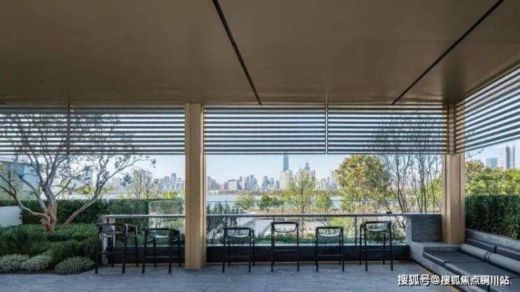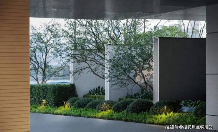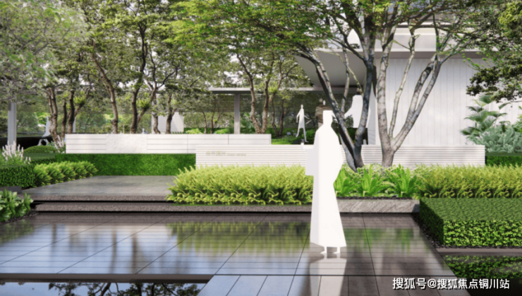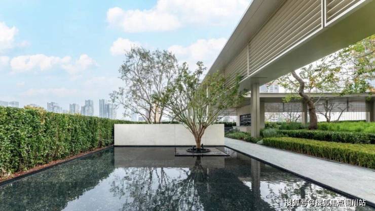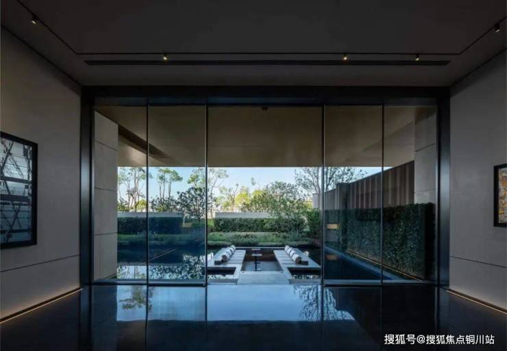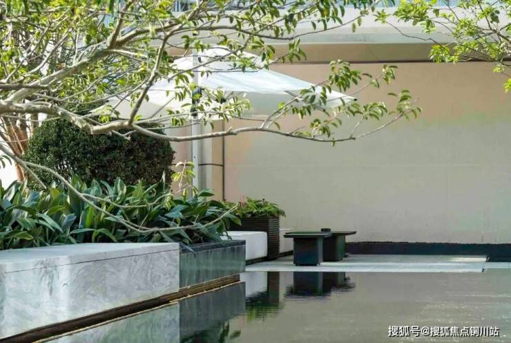 庭院通过水、石、植物构建矩形拼接,自然渗透其中,光影流动间绿意舒展,营造伴水伴林的静谧氛围。