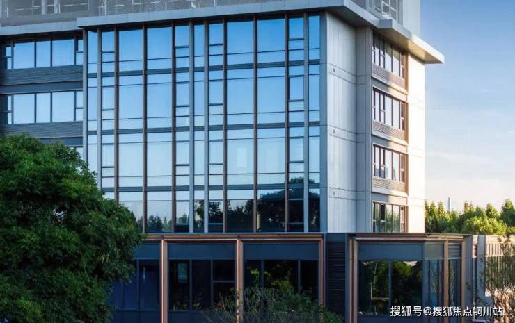 整个外立面不仅仅拥有极致窗墙比,更在用材上甄选银灰色氟碳铝板+浅蓝灰玻璃,嵌入香槟色铝板、点缀香槟翠石材。