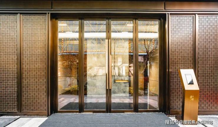 特别震撼的莫过于重金打造的约50米显赫门庭,恢弘气派,材料考究。约9米定制紫铜大门由非遗匠人手工锻造,气势巍峨恢宏。两侧通顶格栅搭配保加利亚灰岩板,呈现出偏内敛的贵感,豪中透雅;地面回形纹铺装,寓意富贵不断、吉利永长;屋檐勾勒云纹环绕,每一处细节极尽匠心,删繁就简。