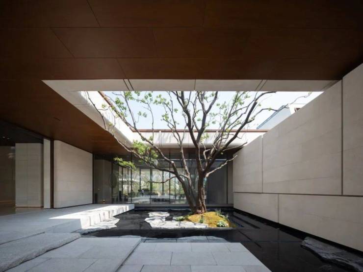 和园还以借景手法,透过归家大堂的玻璃幕墙,将远处湖岸的水杉林与三尊古法铜缸、中景绿荫以及“门海” 水景层层嵌套,打造出动静相宜的写意画面。