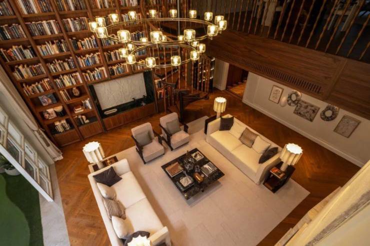 上叠巧妙平衡了社交属性与悦己需求,并在各功能区面积分配上展现出精准的尺度把控:如客厅层:大尺度方厅设计,搭配开放式书房,形成“社交+阅读+观景”三位一体的复合空间。